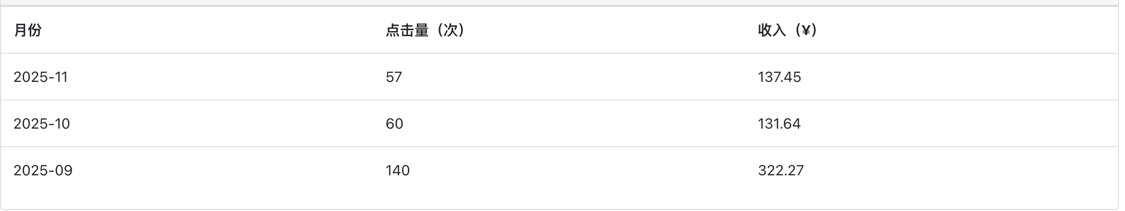 10 月和 11 月的点击量比较少,不过 12 月变多了一些。整体上还是比较少,不过有还是比没有强的😂,如果你也想接入万维广告的话可以使用我的推荐链接(https://wwads.cn?aff_id=1022)注册,无需邀请码。