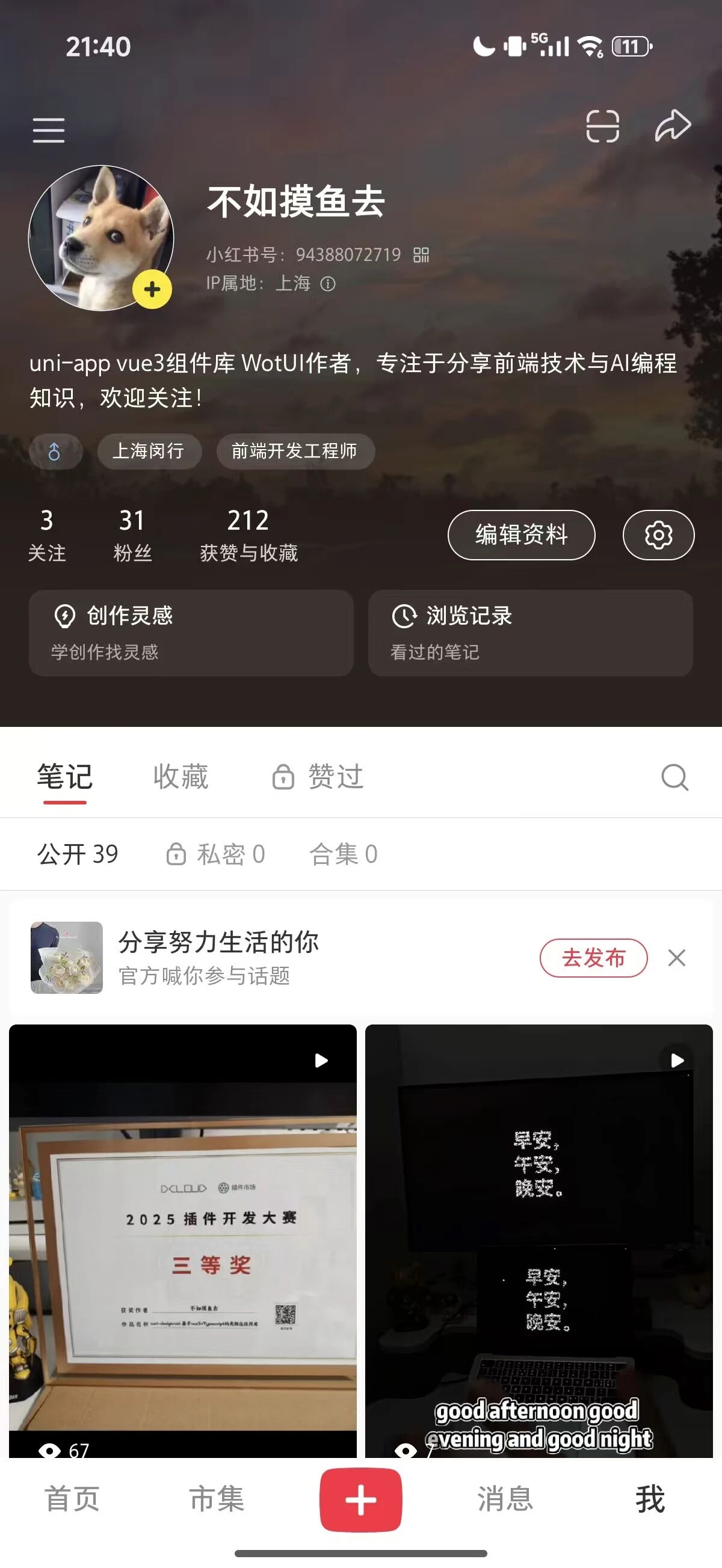 这俩平台是刚开始玩,还不太会做视频,主要是在做技术分享的同时,侧重于生活分享和互动,近期手术经历就是在小红书上分享的,具体见:https://blog.wot-ui.cn/about.html