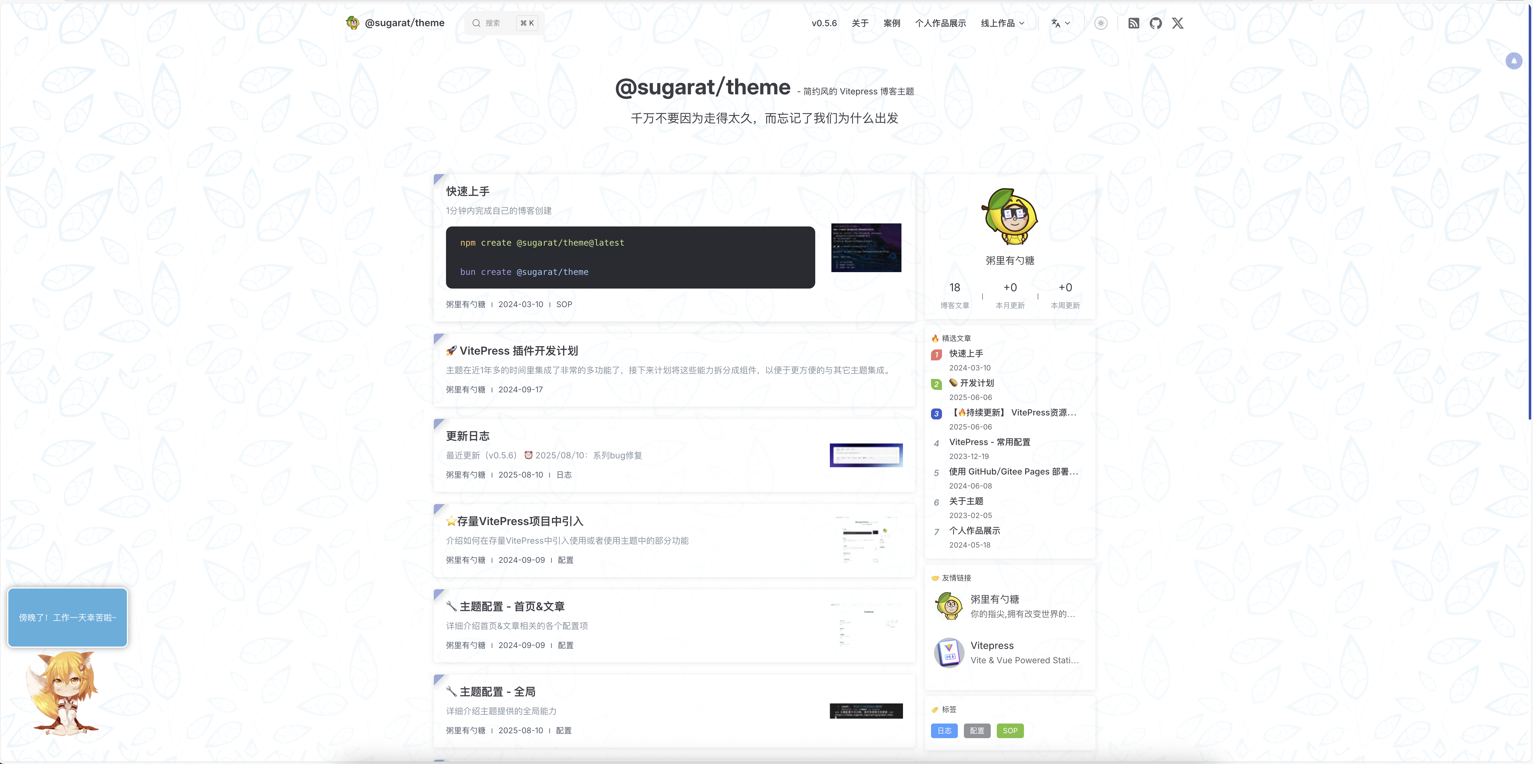 这次我选择了熟悉的 vitepress 来做博客的框架,主题就使用简约风的 Vitepress 博客主题 @sugarat/theme ,其文档见:https://theme.sugarat.top/
