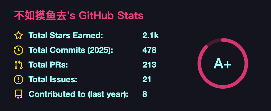 那么还有别的收益吗?例如开源带来的外包或者私活。对我而言,这个其实很难有空去做,一是本来工作就很忙,空闲时间喜欢做点感兴趣的,二是我也比较懒,不喜欢做这些,三是这些活大多是钱不多,工作本身就很累了,做这个还不如出去锻炼来的有益身心。从我的名字「不如摸鱼去」就可以看出来,我是个向往摸鱼的人,所以这方面基本上没有什么收益。