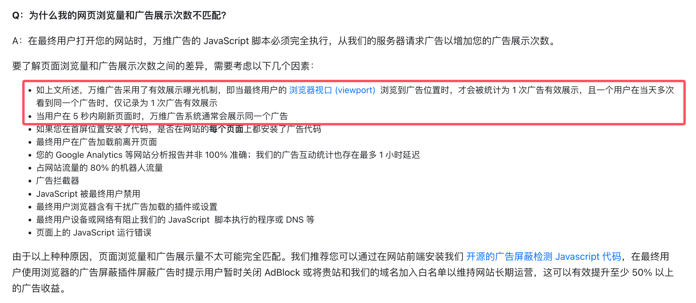虽然感觉 200 块不少了,但是我一直对这个展示量有所怀疑,怎么一天 2~3w 的 pv 才这么点展示量,难道是我的 pv 统计有问题?直到我看到了这个解释: