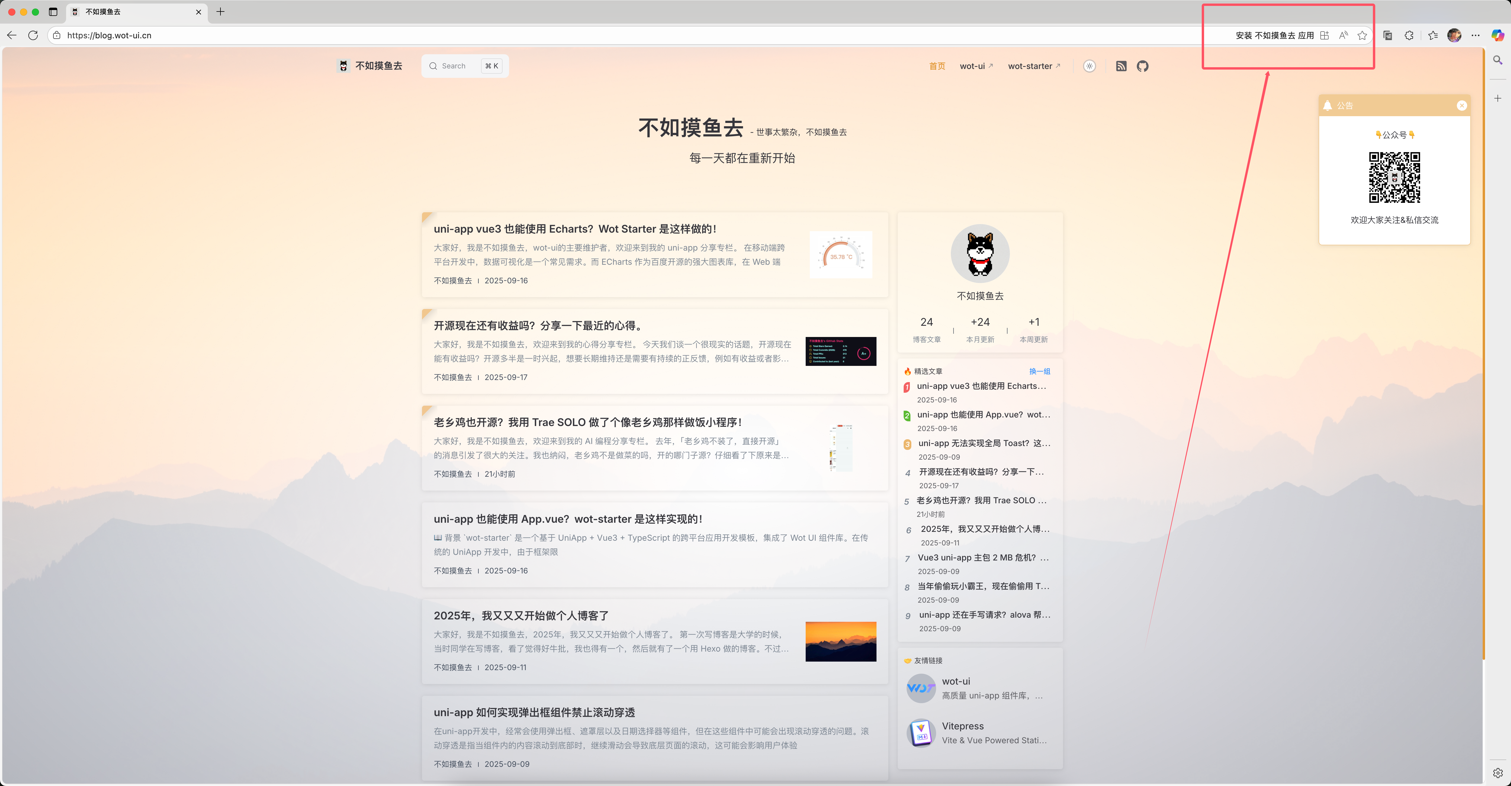 部署上线后,浏览器打开 https://blog.wot-ui.cn/ 会发现地址栏旁边会提示安装应用。