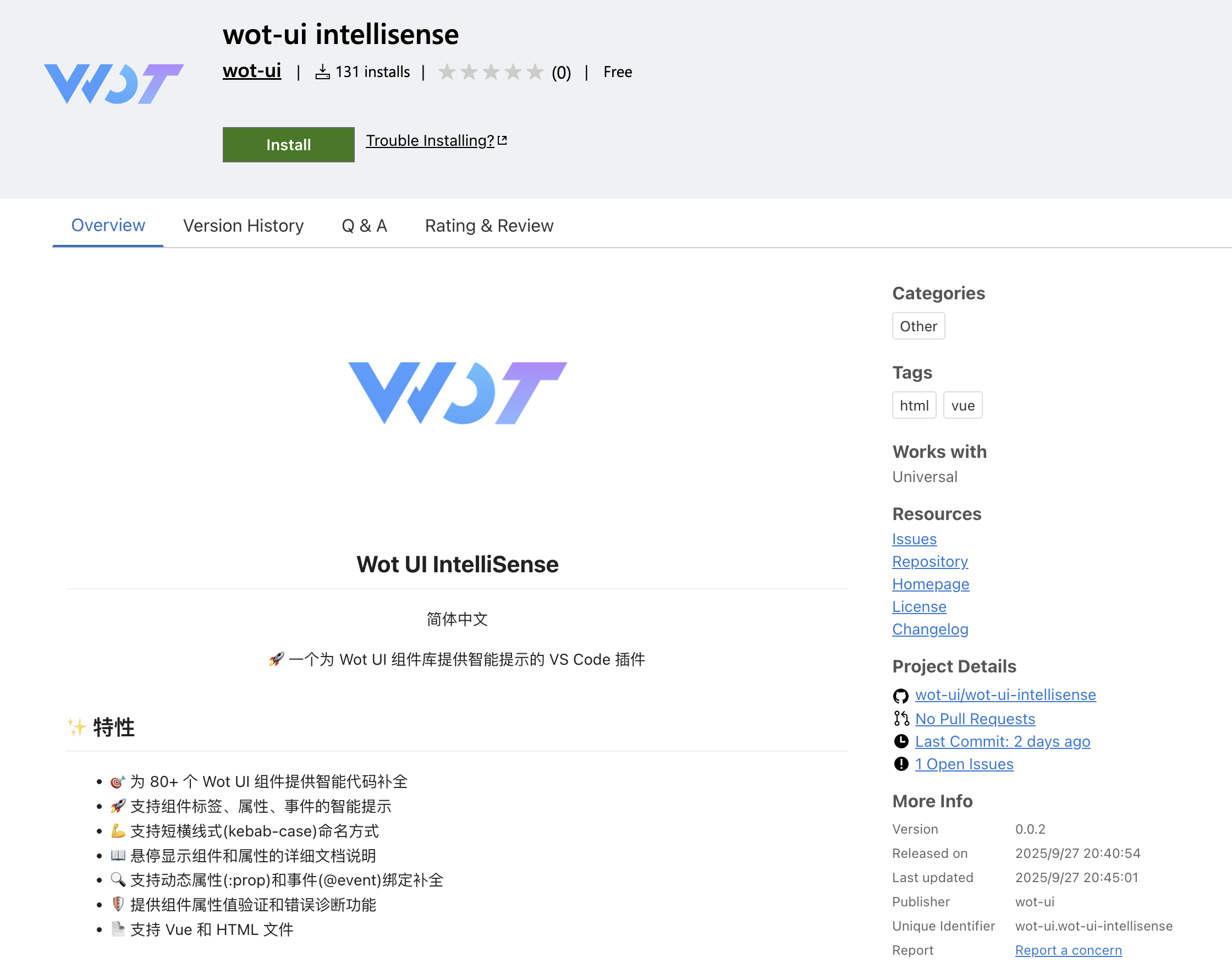 wot-ui intellisense 是一个为 Wot UI 组件库提供智能代码提示的 VSCode 插件,由 Wot UI 团队成员百友提供,它具备以下特性: