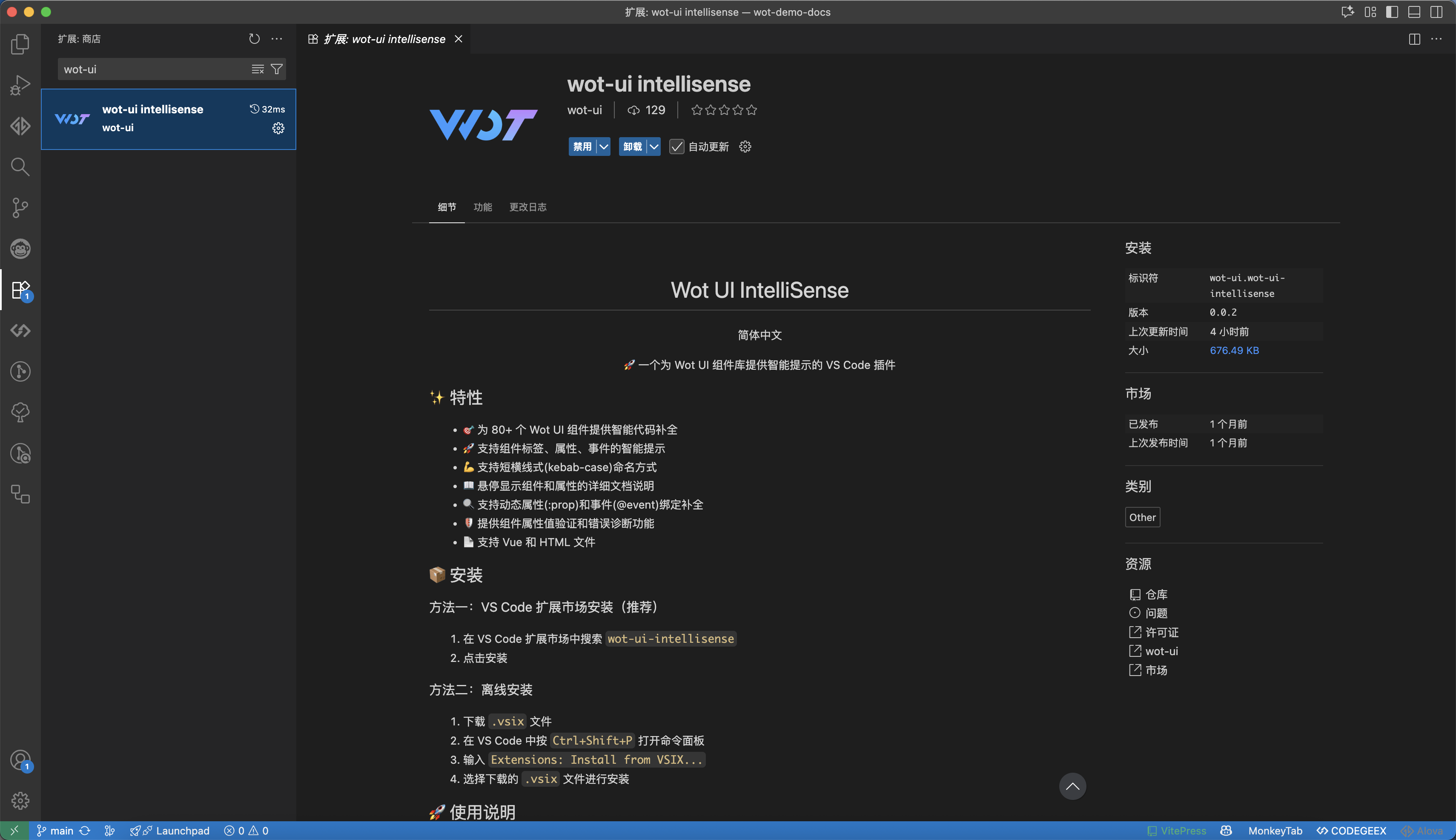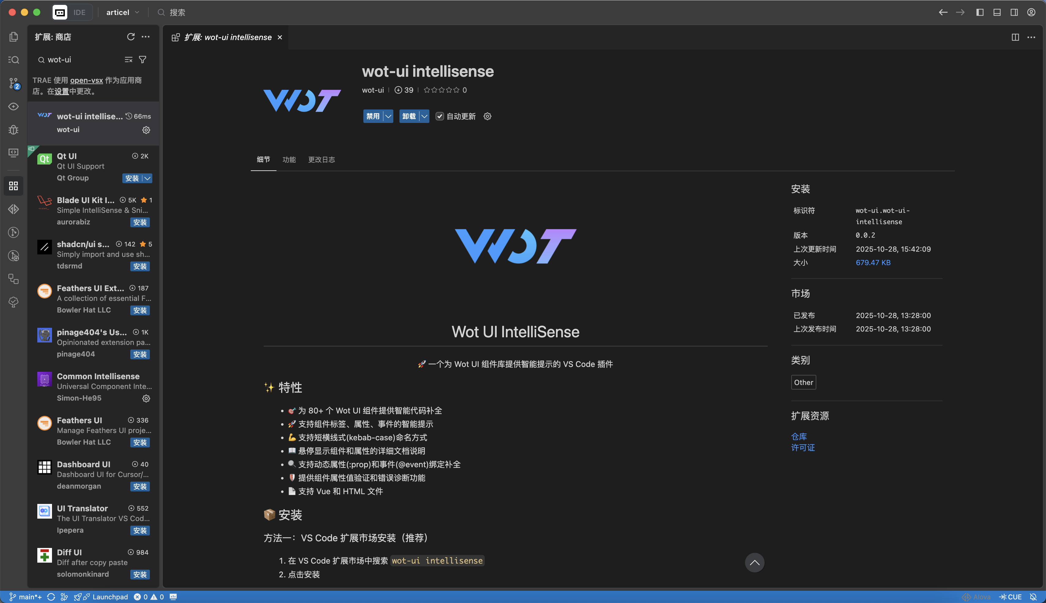 我们可以在 VSCode 和 Trae 的插件市场中搜索 wot-ui 可以看到以下效果。