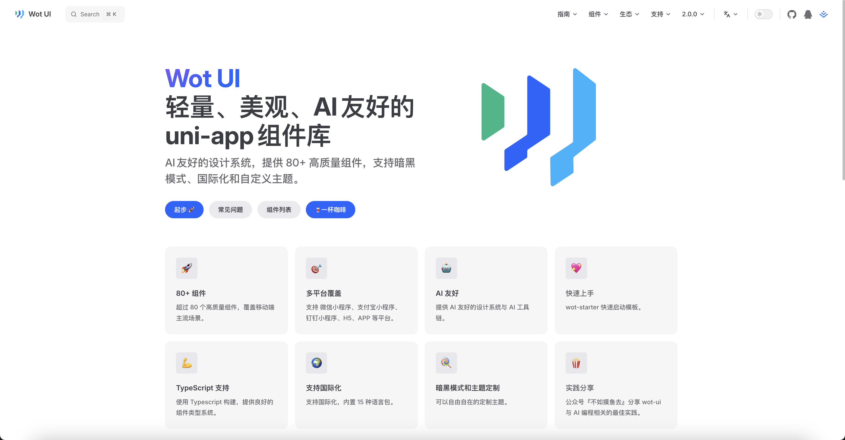 如今已经是 AI 编程时代了,Wot UI 的 slogan 也调整成了「轻量、美观、AI 友好」。我们的目标很直接,就是为大家带来更高效、更易用,也更适合和 AI 协作的 uni-app 开发实践。