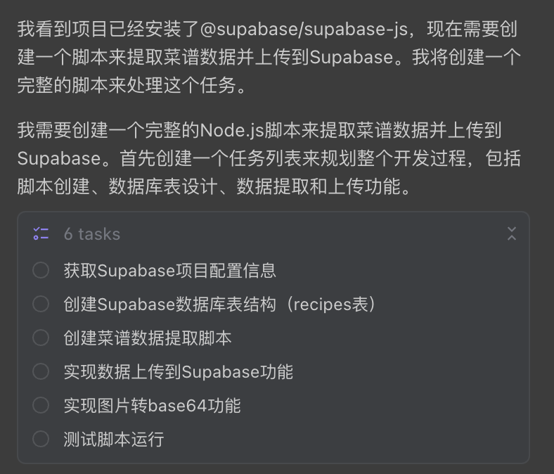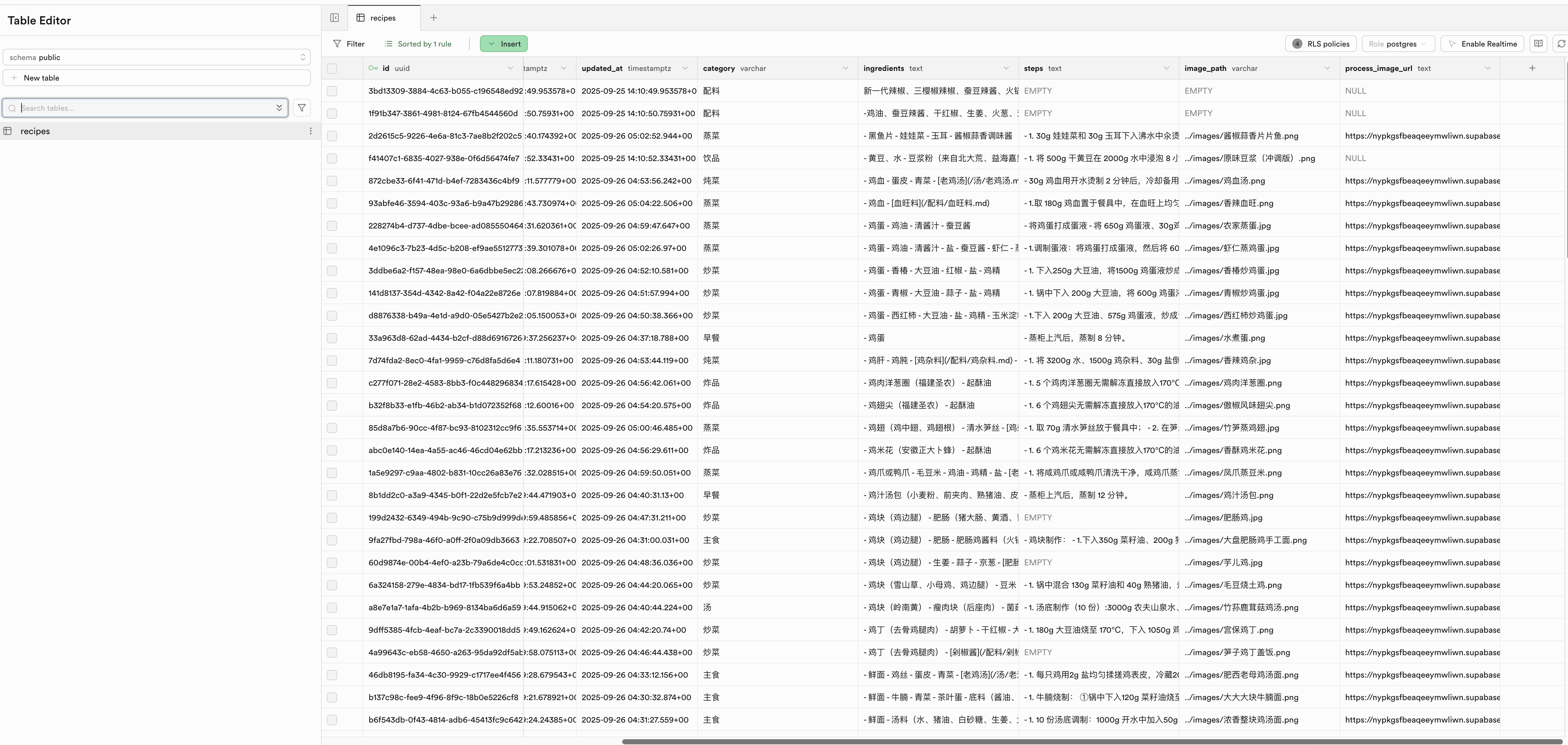 最终,Trae SOLO 帮我将全部的菜谱数据处理完毕,并插入到 Supabase 的数据库中了,接近 200 道菜,足够每天吃一道了。
