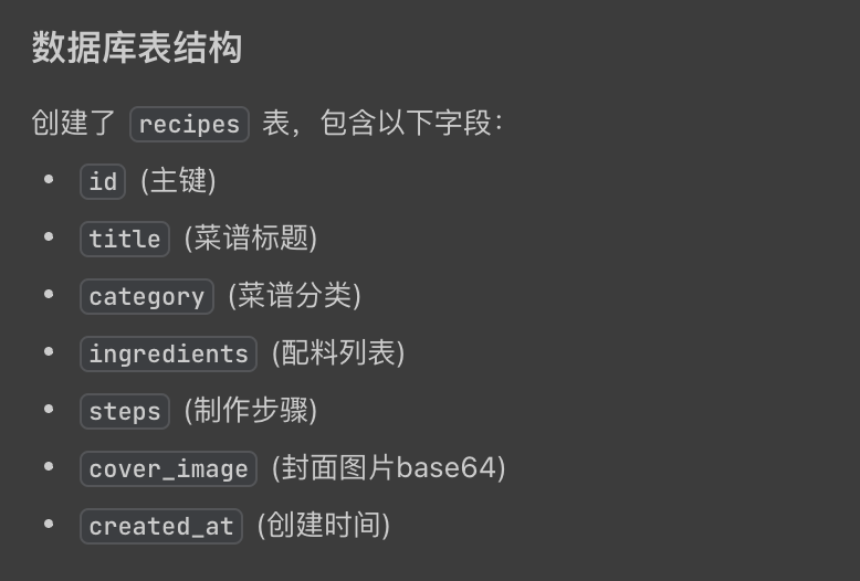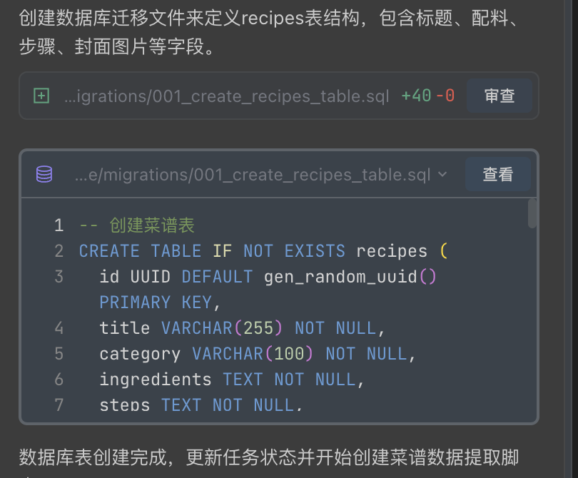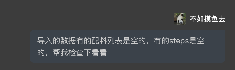 不过它也不是一步到位了,我发现导入的数据有的配料字段是空的,有的步骤是空的,于是让它重新检查了下(后面我自己检查了下发现是部分菜谱的 markdown 文件的标题不对,这里我就自己处理了)。
