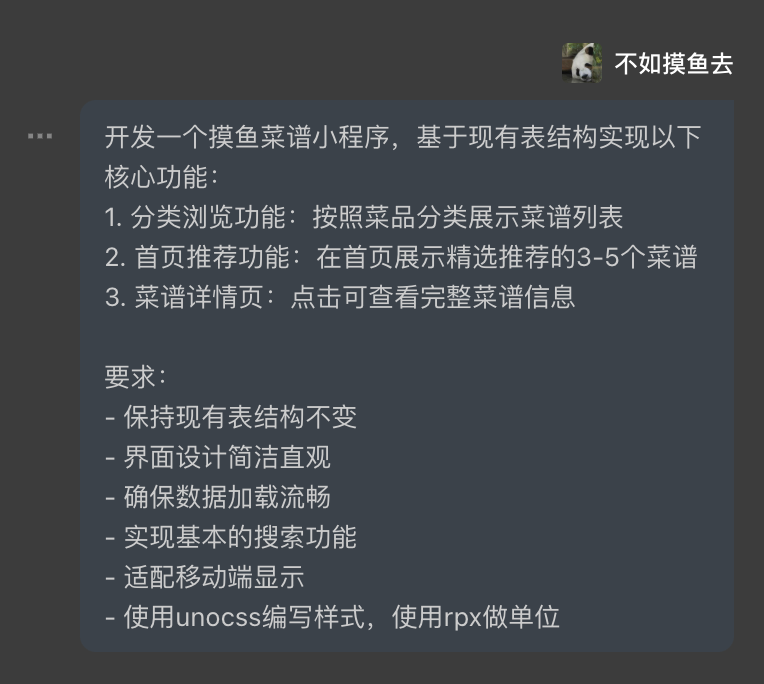 好了,实现这个小程序后,我再也不愁没菜吃了!后面我想还可以加一些有趣的功能,例如:今天吃什么、每周必吃、大家都在吃,等等功能,当然这些功能也是由 Trae 来开发,大家可以期待下,同时也期待未来 AI 编程能给我们带来更多、更强的能力,让我们能专注于更重要的「业务逻辑」。