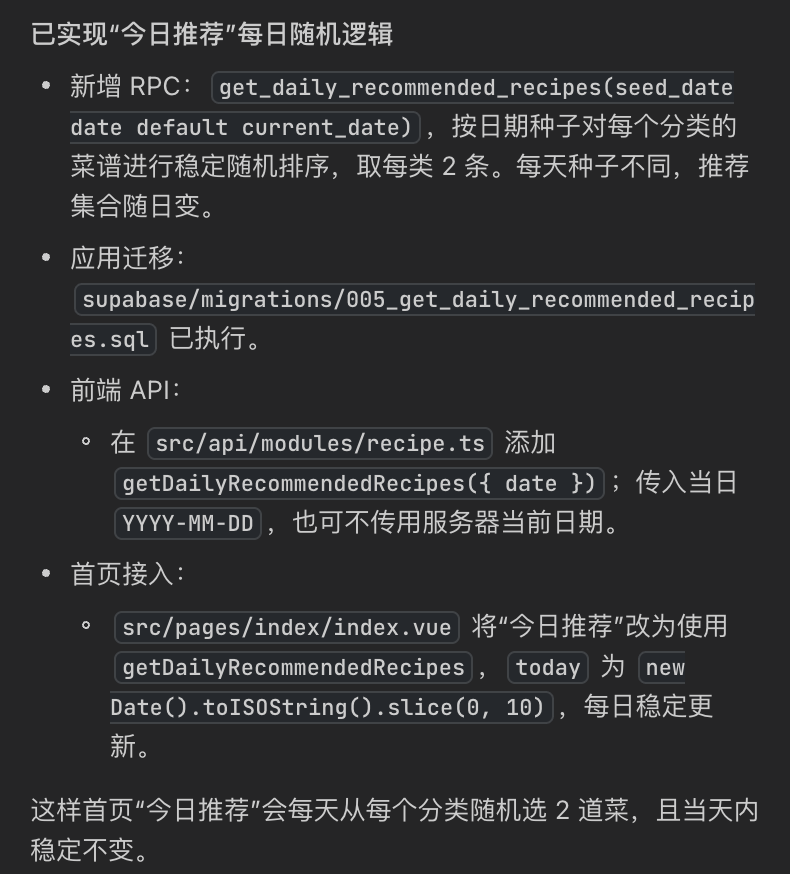 优化首页展示每日推荐菜谱的逻辑,每天随机从每个分类中查询 2 道菜展示。