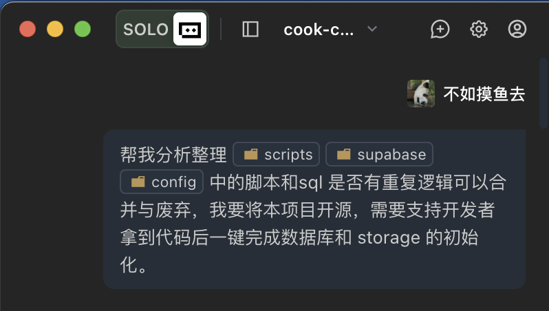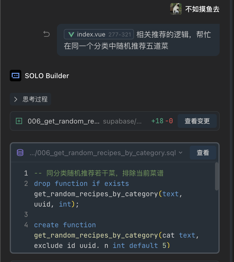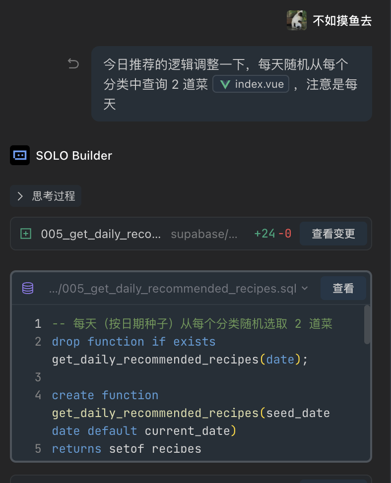 需要注意的是,如果你的操作需要操作数据库,可以切换到 SOLO Builder 模式,让它协助操作,建表、执行SQL、获取 supbase 配置,它都可以胜任。