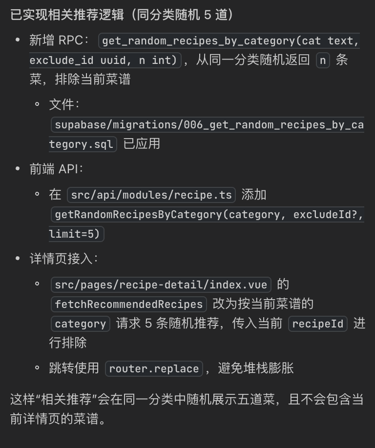 优化菜谱详情页面相关推荐的逻辑,当前菜谱的相同分类中随机推荐五道菜。