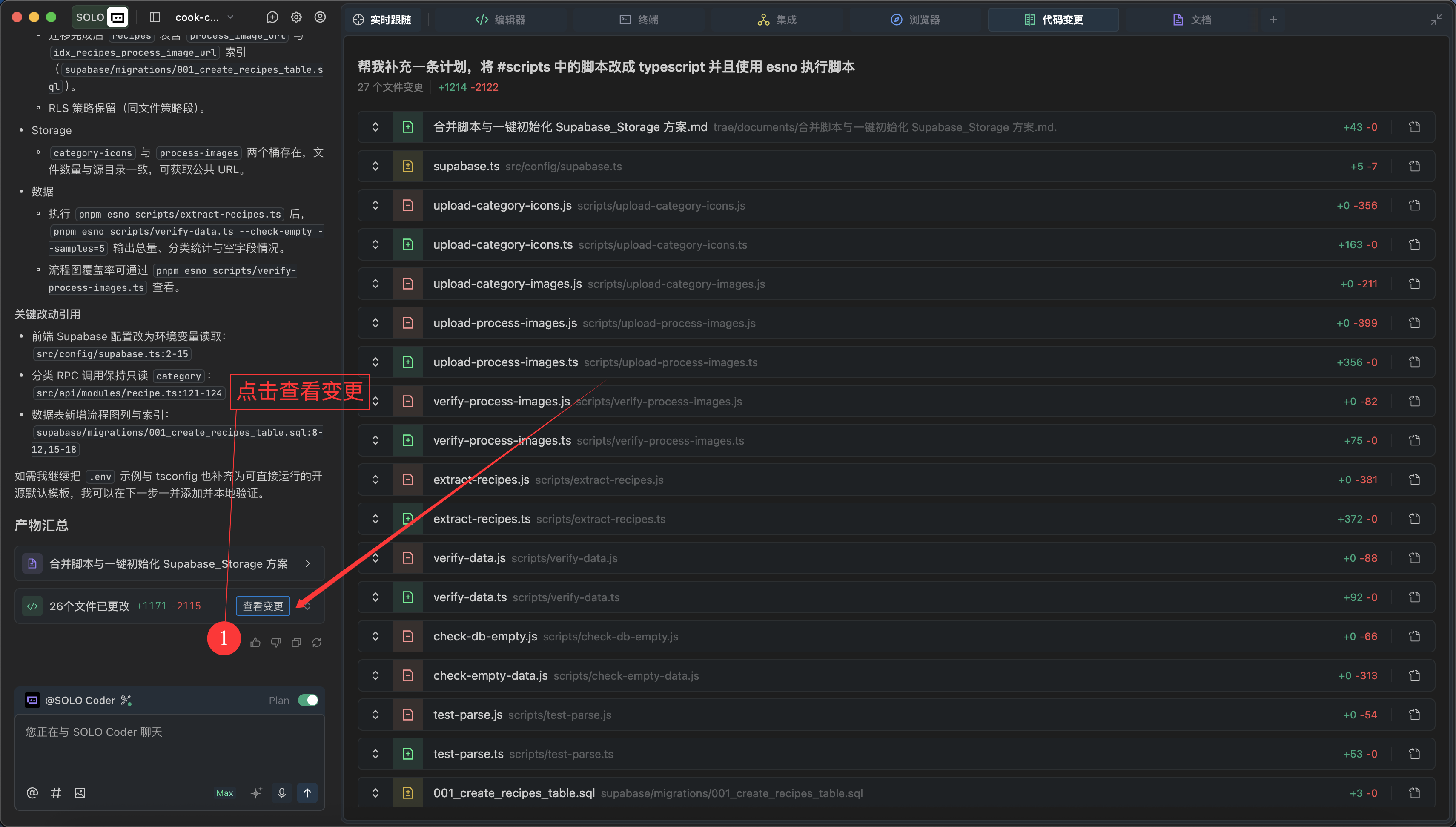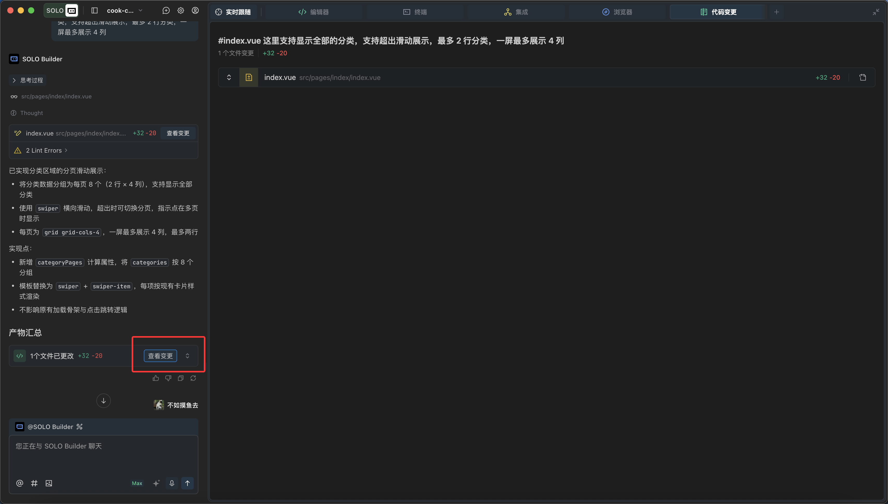 SOLO Coder 执行完毕后,我们点击查看变更,使用 DiffView 功能检查变更文件,判断 SOLO 执行是否正确。