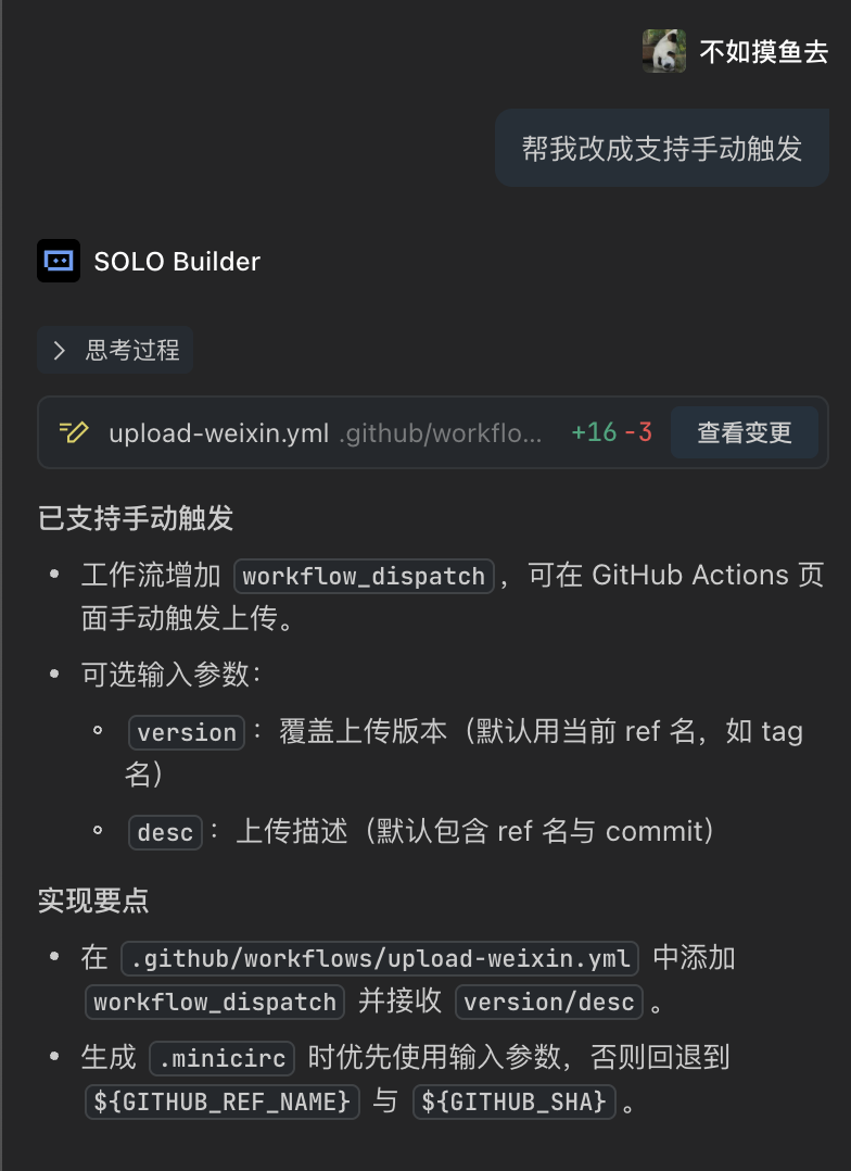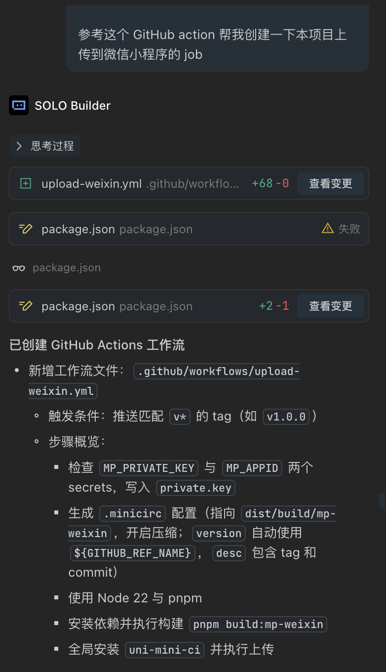 我们几乎零代码 用 Trae SOLO 完成了「像老乡鸡那样做饭」小程序的开源与 CI/CD 流程,过程中保持数据干净、纯净上下文、增量式沟通等三个原则仍然是使我们事半功倍的利器,这其实和当下很流行的 SDD 规范相符,在这种小型项目中,基于一个优秀的项目模板和良好的需求输入和开发计划,由规范驱动开发,能让项目做的更好、走得更远。