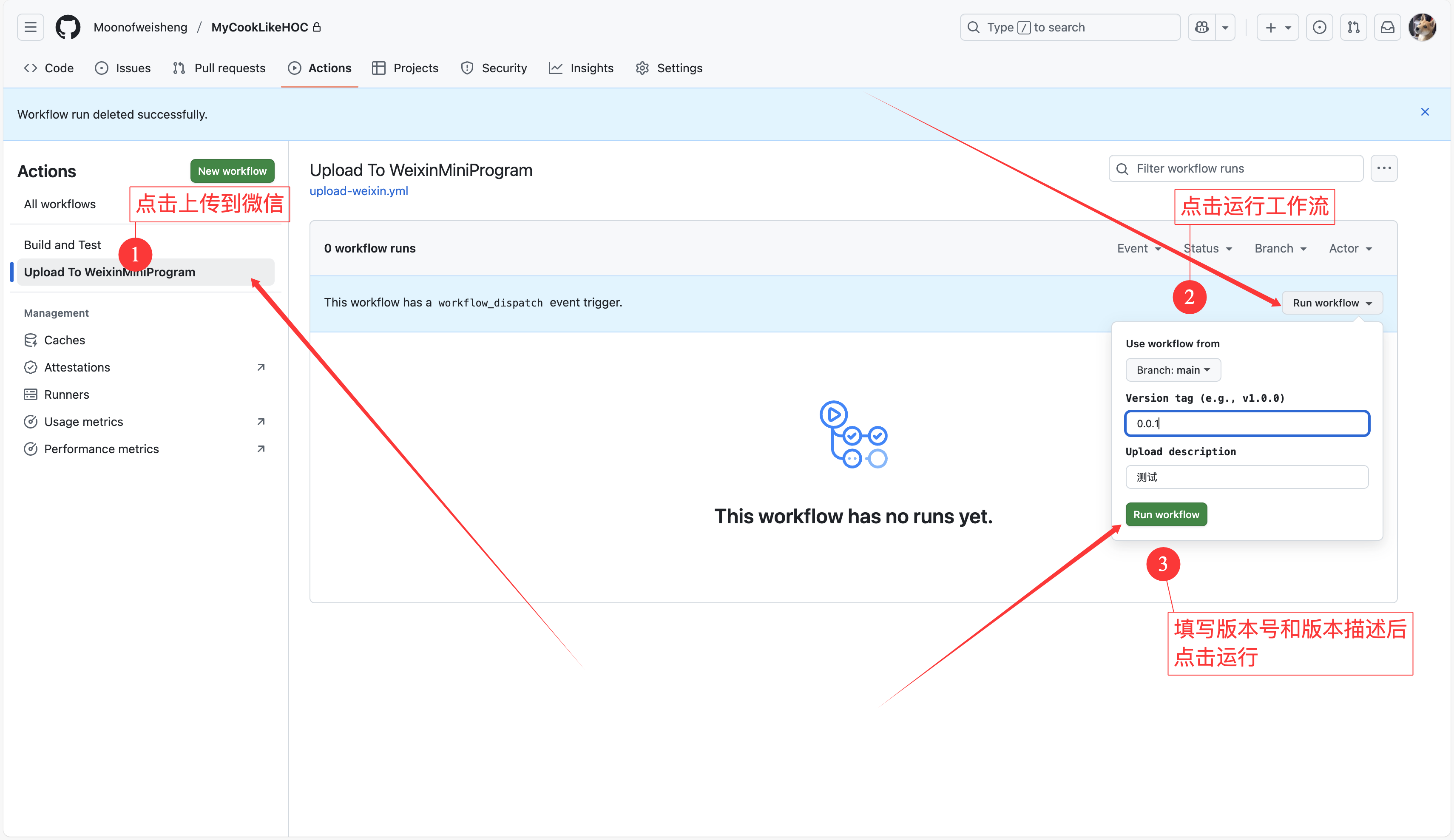 将 GitHub Action 配置文件推送到 GitHub 上,就可以按照下图操作进行手动发版,当然也可以通过打 tag 触发发版,发版执行会将代码推送到微信小程序后台。