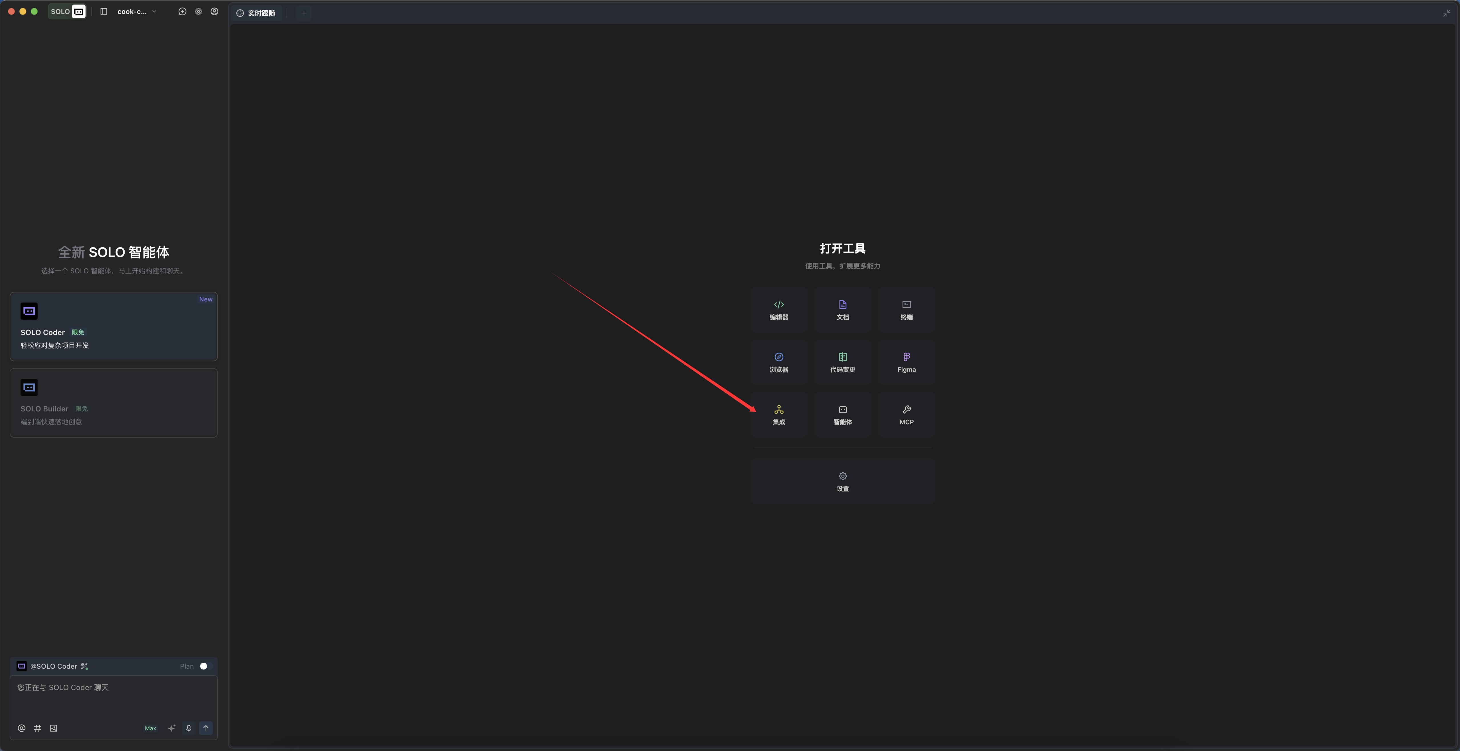 打开 TRAE SOLO 模式,可以在这里找到“集成”功能