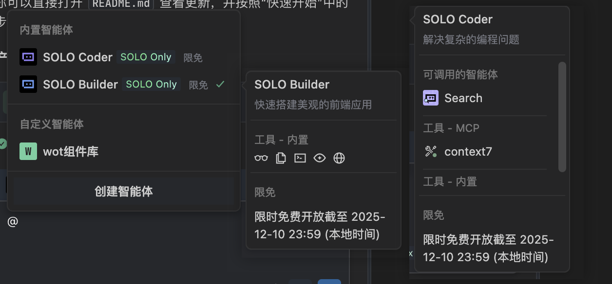 需要注意的是,我们在使用“集成”功能时,最好切换到 SOLO Builder 模式,因为在这个模式下才有“集成”功能,下图是 SOLO Coder 和 SOLO Builder 的区别: