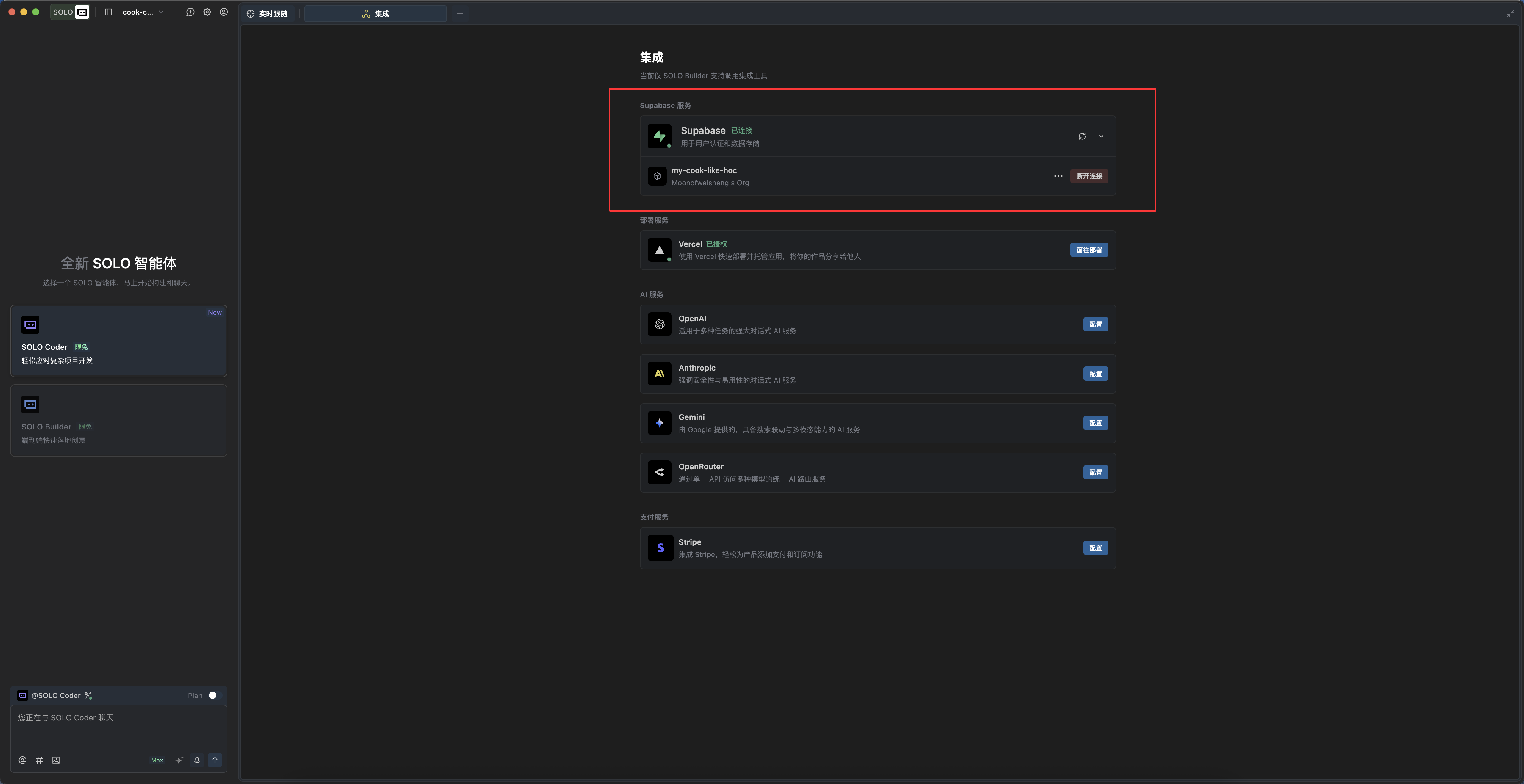 进入“集成”功能,选择连接我们的 supbase。