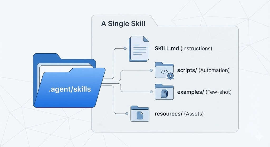SKILL.md(必选):核心指令文件。包含 YAML Frontmatter(定义名称和描述)以及详细的 Markdown 指令。scripts/(可选):辅助脚本。例如自动化代码生成的 Python/Go 脚本,Agent 可以直接调用这些脚本来完成复杂任务。examples/(可选):示例参考。提供“正确答案”的范例,让 AI 通过 Few-shot 学习快速掌握风格。resources/(可选):额外资源。如配置文件模板、静态素材等。