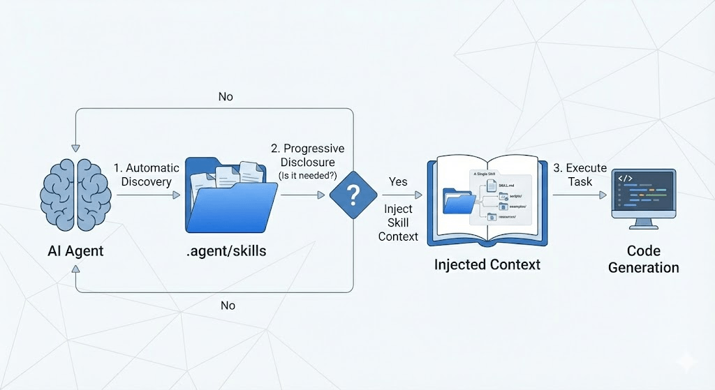 .agent/skills目录时,Agent 会定期扫描这些目录。 - 渐进式披露 (Progressive Disclosure):Agent 不会一次性读取所有 Skill(那太费 Token 了)。它会根据