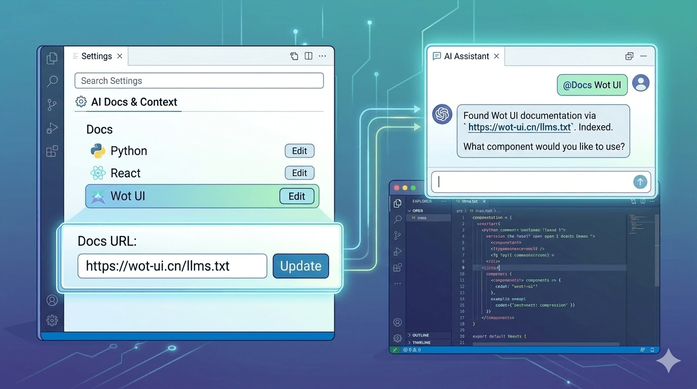 众所周知,Wot UI 是一个 AI 友好型的组件库,本指南旨在介绍如何让 VSCode、Cursor、TRAE、Antigravity 等 AI 工具更好地理解 Wot UI 组件库。